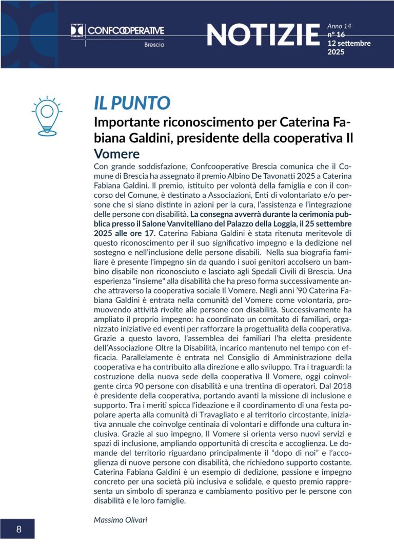 Il 24 settembre il comune di Brescia assegnerà il premio De Tavonatti alla nostra presidente Caterina Galdini Il Vomere è lieto del riconoscimento che sarà conferito a Caterina Galdini. Pubblichiamo l’articolo del notiziario di Confcooperative che descrive le motivazioni. Un…